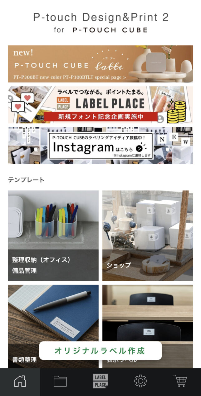 こちらはDesign&print2というピータッチキューブ専用アプリの画面です。テンプレート掲載数も多く、使いやすい印象を持ちました。QRコード印刷に関してはシェアラベルの項目内にまとまってるのでそこだけ注意。最初分からなくて探しちゃったよ!LABEL PLACEというユーザー同士で作ったテンプレートをシェアするサービスもあるのでデザインに困ったらこちらを見るのが良さそう。