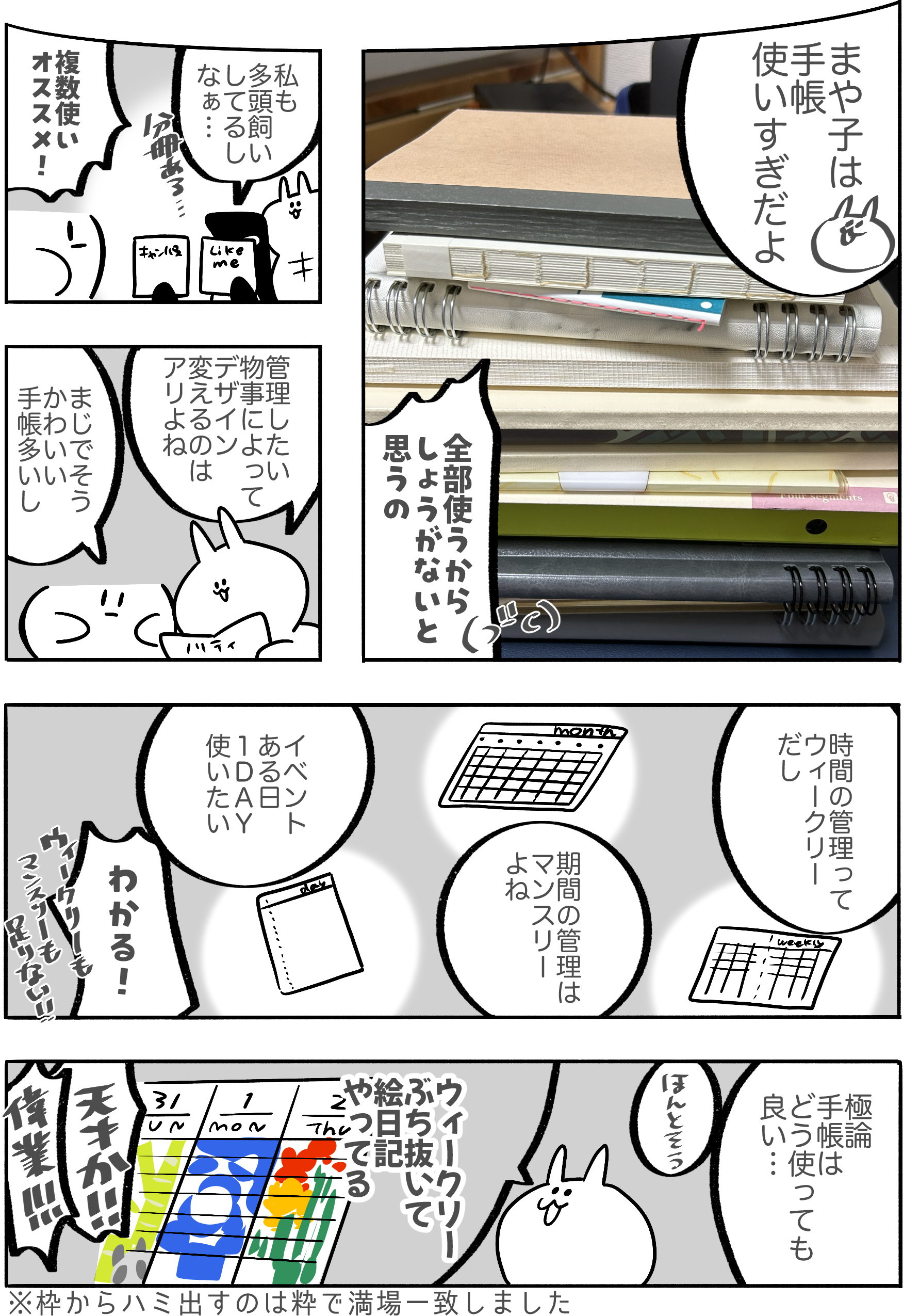 今回初の試みでレポ漫画をふんだんにあしらってみました。手帳会議で手帳会議してたわけですが、実際にこうやって使ってますをまとめるのって個人的に楽しいと思ってるので続けたいところ…。人の手帳見るの大好きなので……。最後の手帳布陣の他にも使いたいものたくさんあるので、気づいたら来年増えてるなんてことあるかもしれないです。増えるよ、絶対増える。