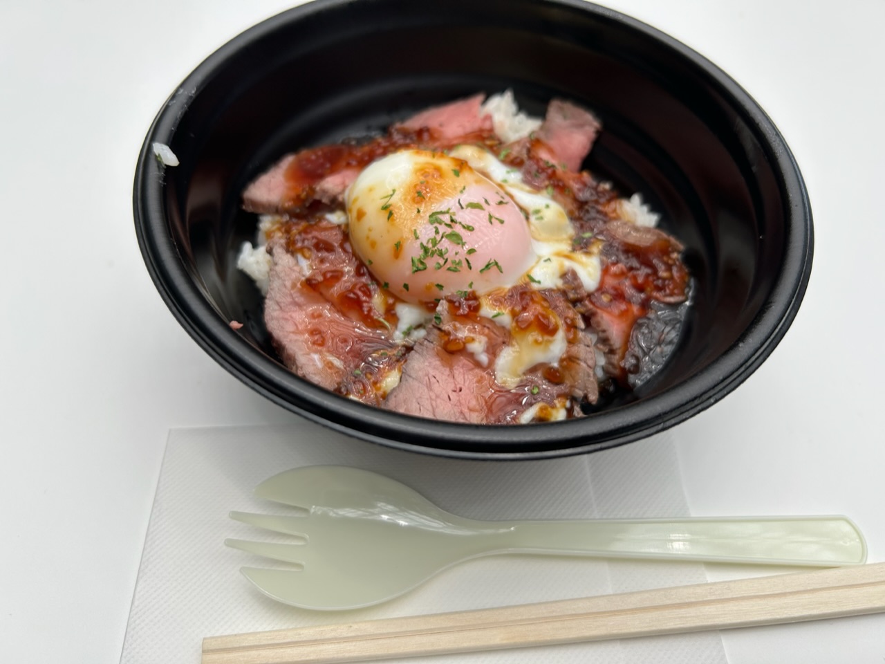 西ブースキッチンカー・金肉さんのローストビーフ丼と同じくキッチンカー出展・FRANCE DOGさんのバナナスムージー、企業ブース02・TEE HAUS MOZARTさんのクロークムシューを頂きました。