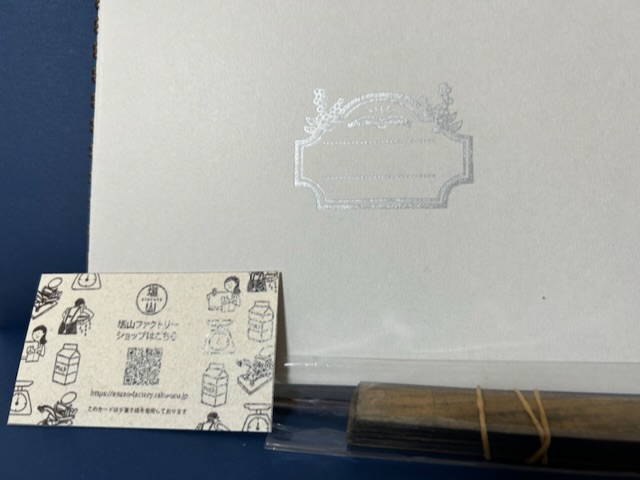 ブース名はクロッキーズさんですが、頂いた名刺が鳩山ファクトリーショップ… 多分いろんな会社さんが集まってやっているのかもしれない。表紙が活版印刷のリングノート製本ワークショップをやっていたので、クラフト紙を挟んだオリジナルリングノートを作ってもらいました。オマケに込め物も頂きました。活版印刷で活字を組む際に余白をつくるための道具のことらしいです。「スペースはこれになるんだよ〜」のお話面白かった…。