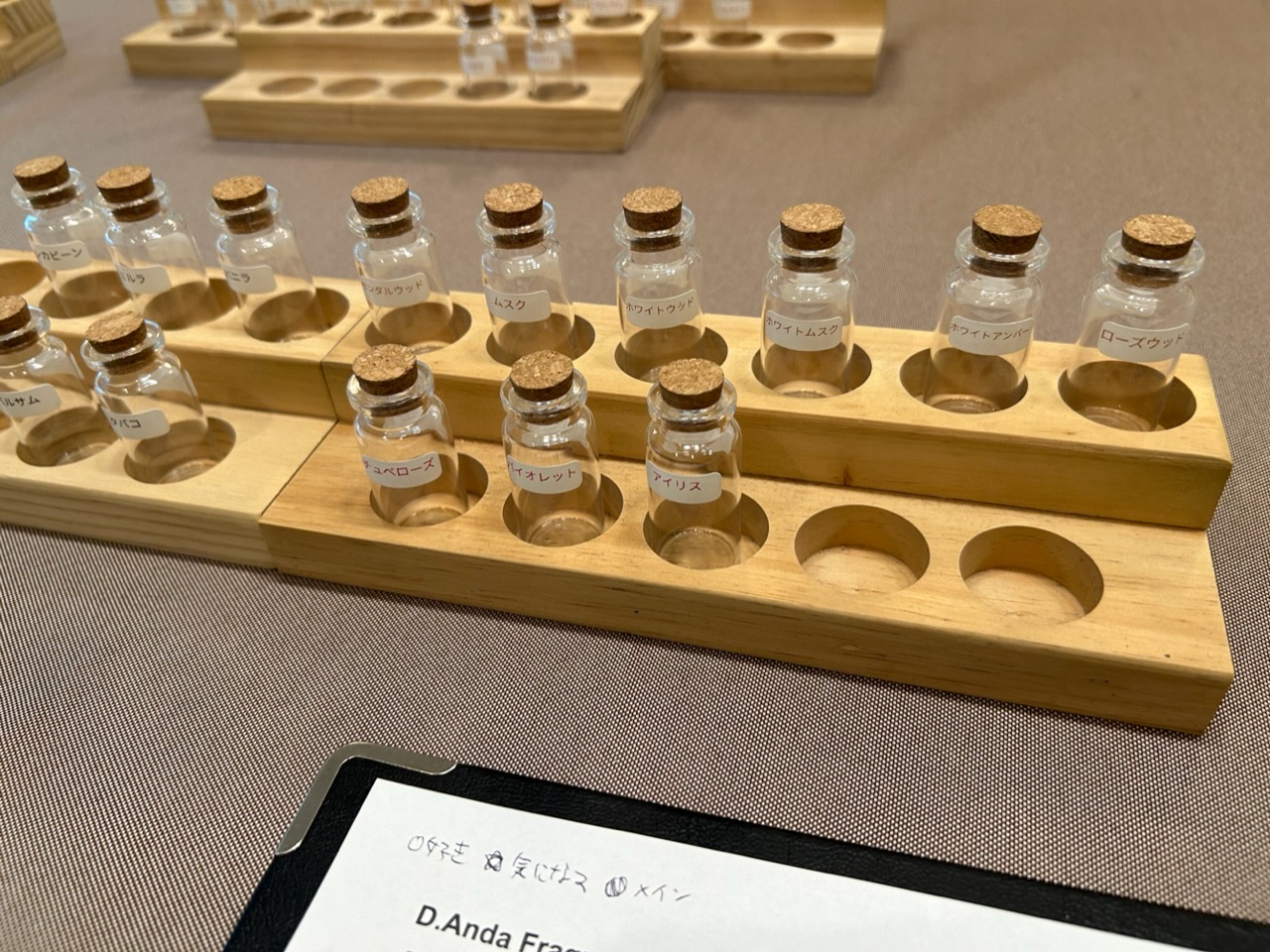 完成系の香りのテストを頂き、イメージと離れてないかを確認します。このタイミングで調整を行うと前の香りには戻れないそうなので、こちらもしっかりと要望を伝えつつ、細かい部分も確認して頂きました。
