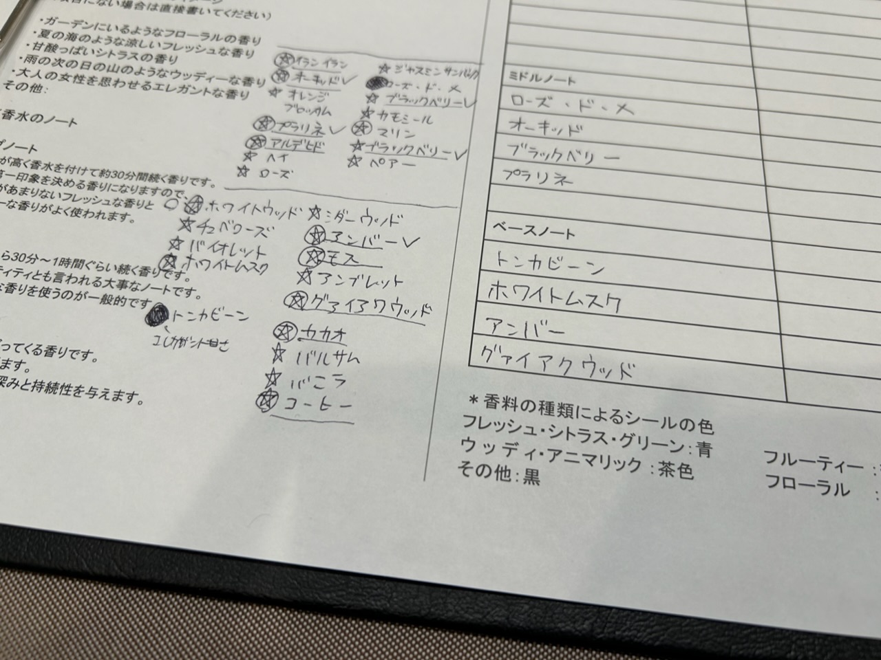 私は★気になる匂い、○好きな匂い、●メイン香料でそれぞれ香料名のメモを取りました。★気になる匂いはイメージ元の白臉がまとっていそうな香りで選別しています。さらに星マークの香料から自分の好きな香りを○で囲うことでイメージを作っていきました。こうすると自分の苦手な匂いになりにくいかなと思います。