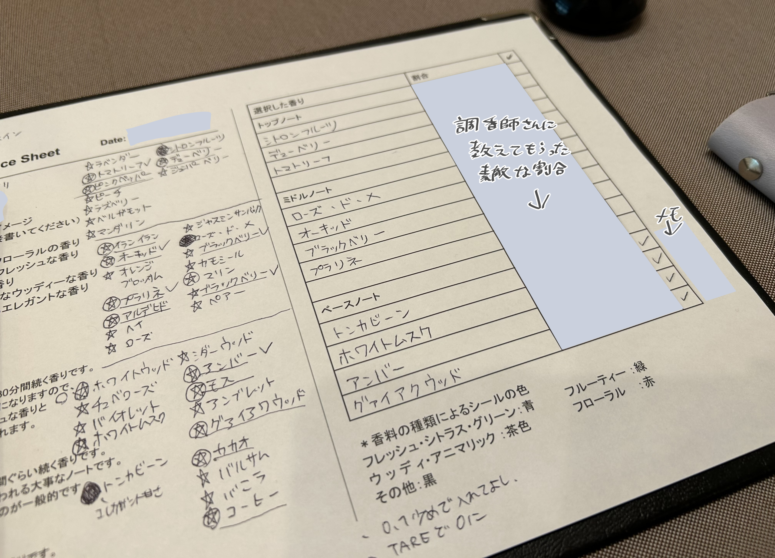 気になる匂いと好きな匂いは複数選び、メインの匂いは一つのみ選ぶとのこと。香料サンプルを並べて頂き、匂いを確かめながら専用シートにメモを取っていきます。少ないと選別が大変らしいので、気になるものはどんどん入れて行こう。ベースノートは一番持続時間の長い香りとのことで、本人が移動した後に残る匂いってこれかな…と考えながら決めています。